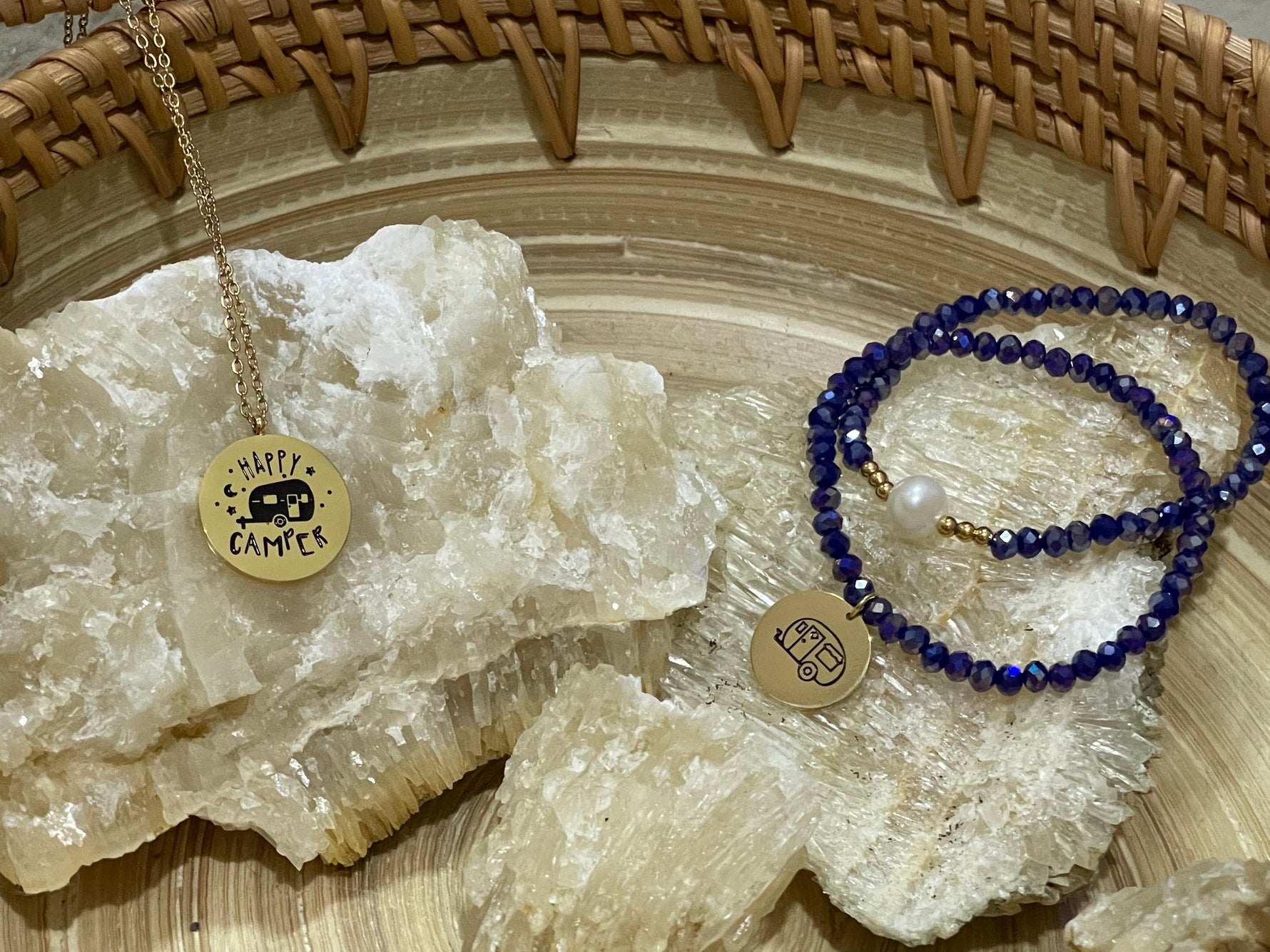 Dale un toque divertido a tu estilo con este conjunto que incluye un collar de 18" en acero inoxidable color oro con un lindo dije de camper. Las dos pulseras que lo acompañan añaden un toque único y colorido para que siempre luzcas lista para la aventura. Perfecto para combinar y destacar en cualquier ocasión.