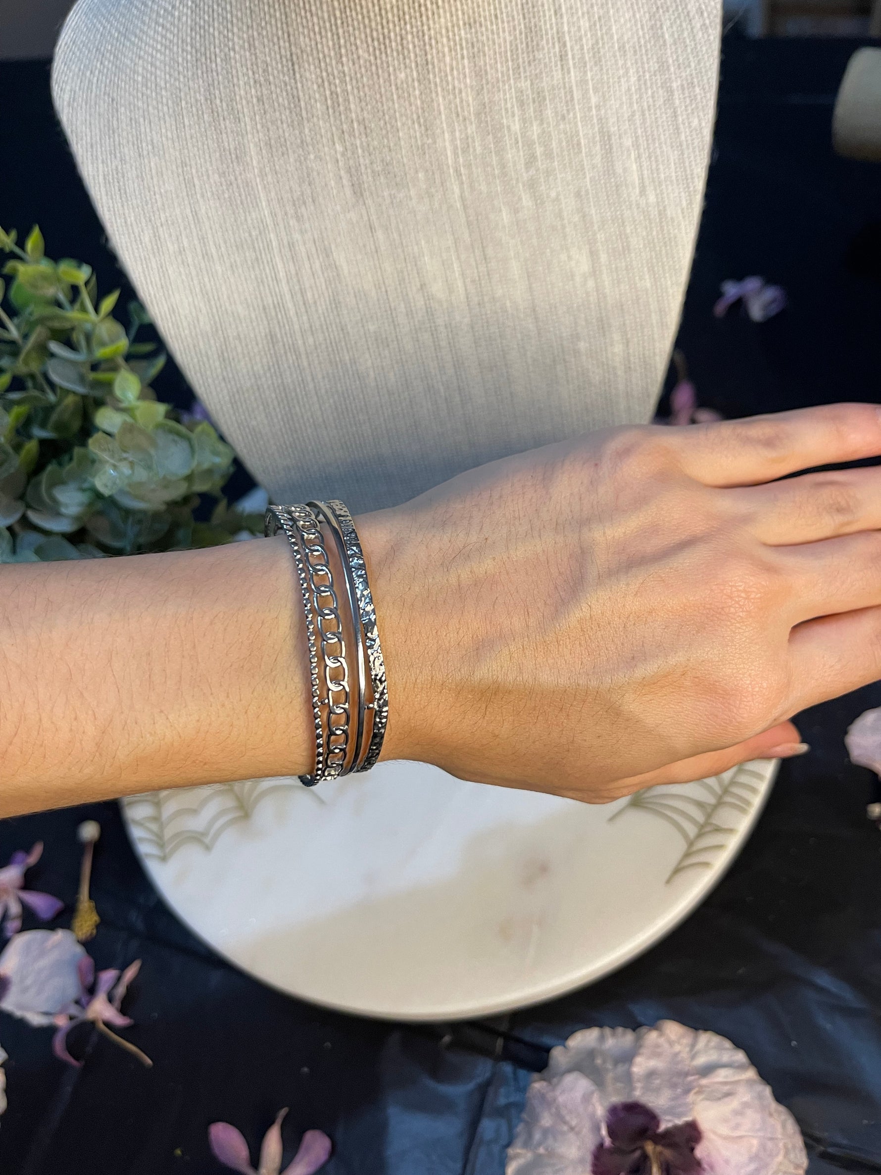 Descubre Elara, la pulsera ajustable de acero inoxidable plateado que desafía lo común. Su diseño versátil y moderno se adapta perfectamente a tu muñeca, aportando un toque audaz y sofisticado a tu estilo diario. Resistente y brillante, Elara es la pieza ideal para quienes buscan destacar con seguridad.