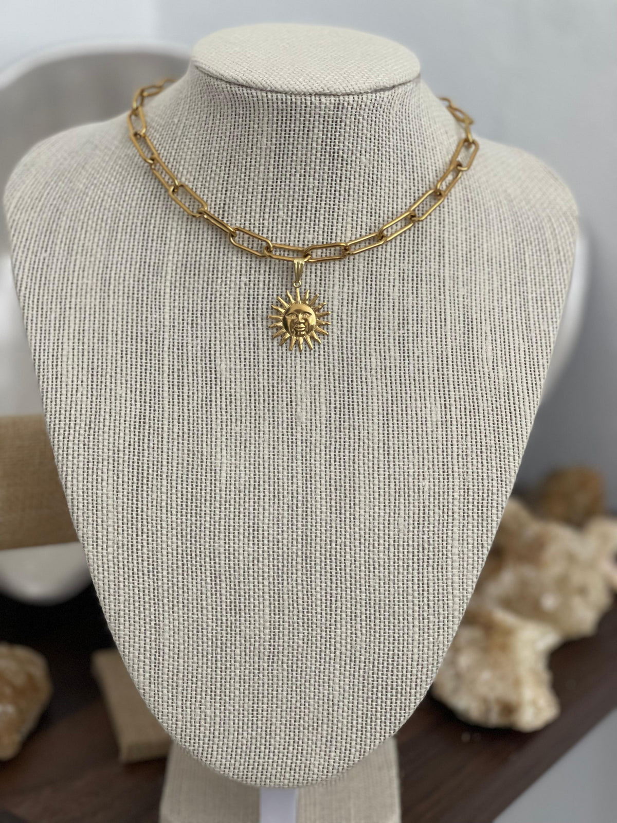 Este elegante accesorio de acero inoxidable de 14" con extensor de 2'' presenta un delicado dije en forma de sol con acabado en color oro, que aporta un toque sofisticado y duradero. Ideal para quienes buscan una pieza resistente y con un diseño atemporal que realza cualquier estilo. Su composición garantiza resistencia al desgaste y brillo prolongado, haciendo de este complemento una elección experta para el uso diario o ocasiones especiales.