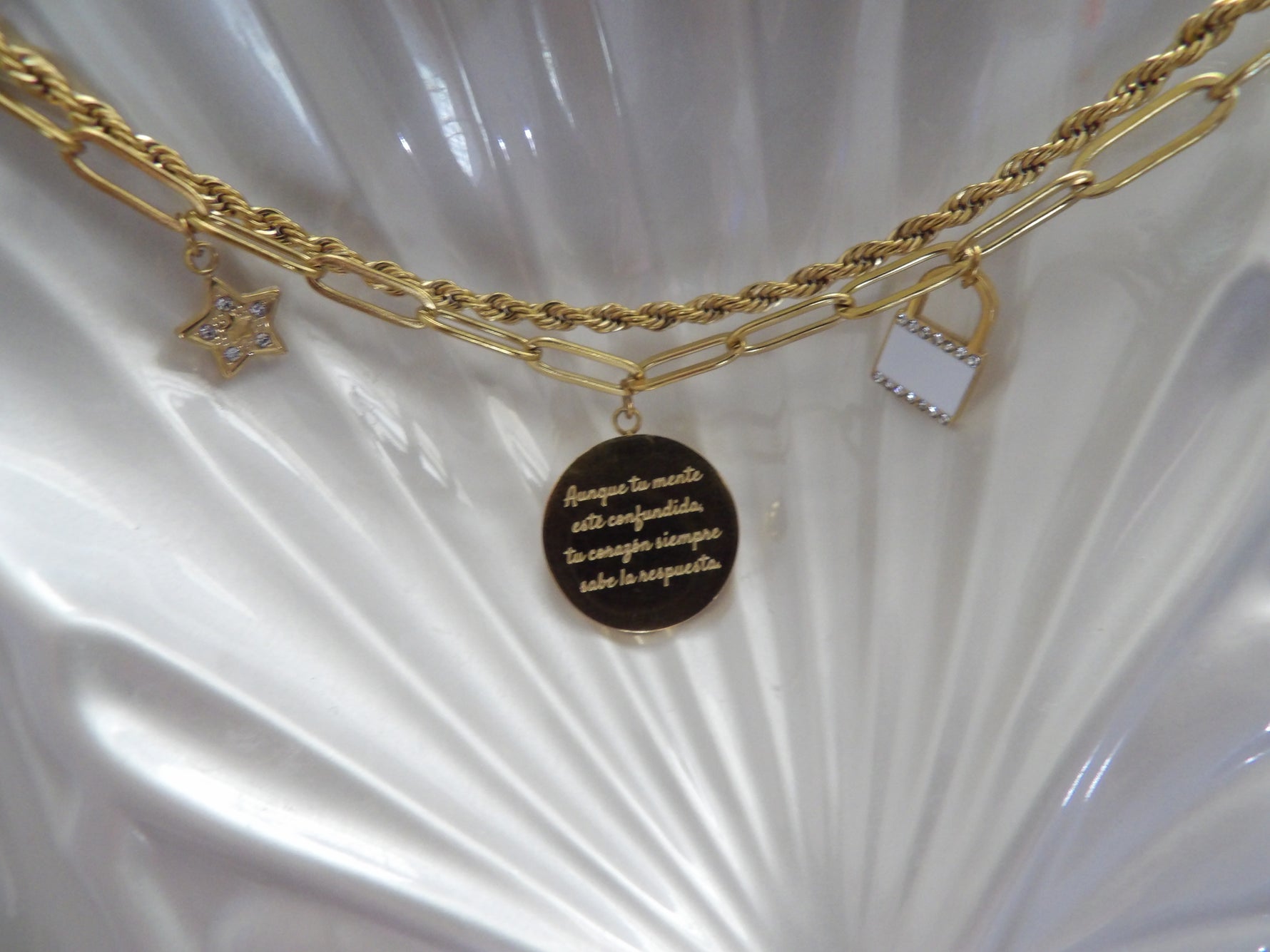 Esta pulsera doble de acero inoxidable combina elegancia y significado profundo. Con la frase grabada "Aunque tu mente esté confundida tu corazón siempre sabe la respuesta", ofrece un recordatorio sutil y sofisticado para confiar en la intuición. Su diseño duradero y estilizado la convierte en el accesorio ideal para acompañar cualquier look con un toque de reflexión personal.